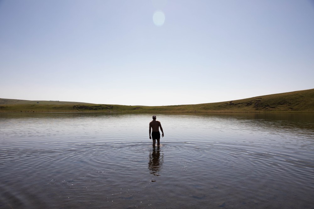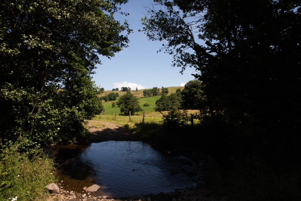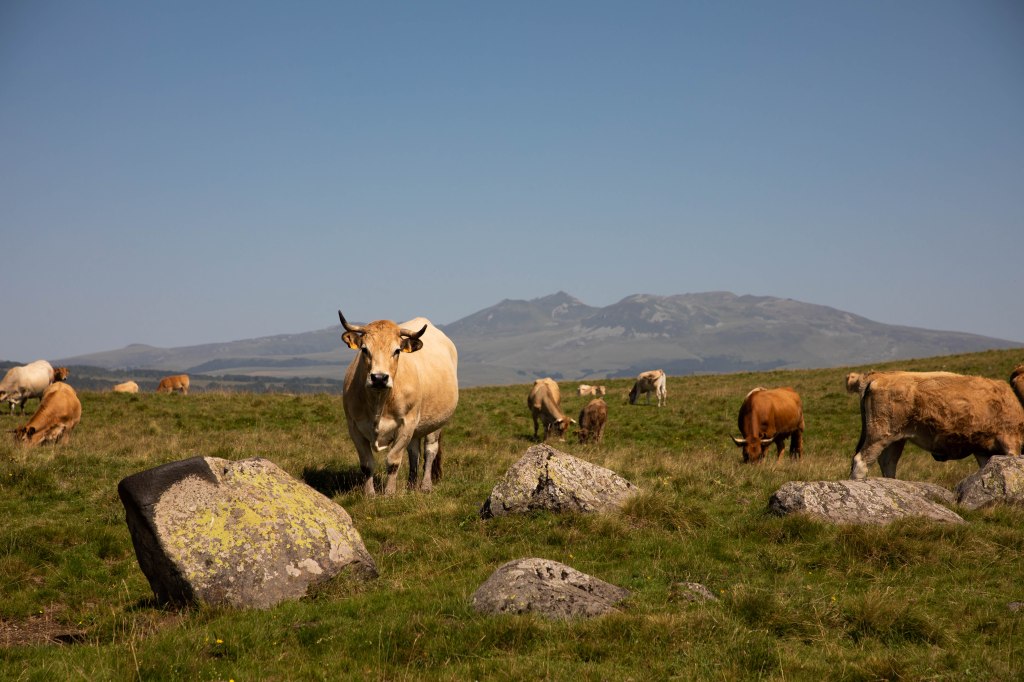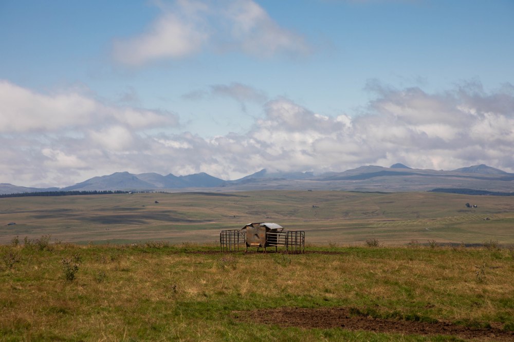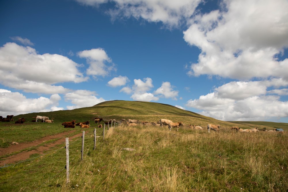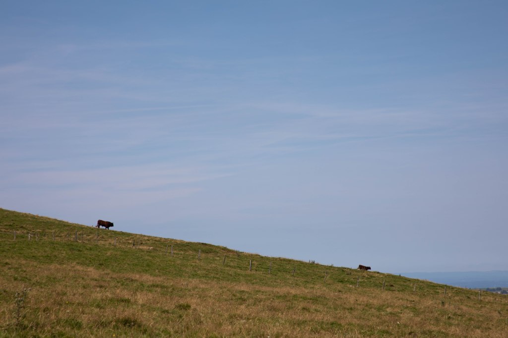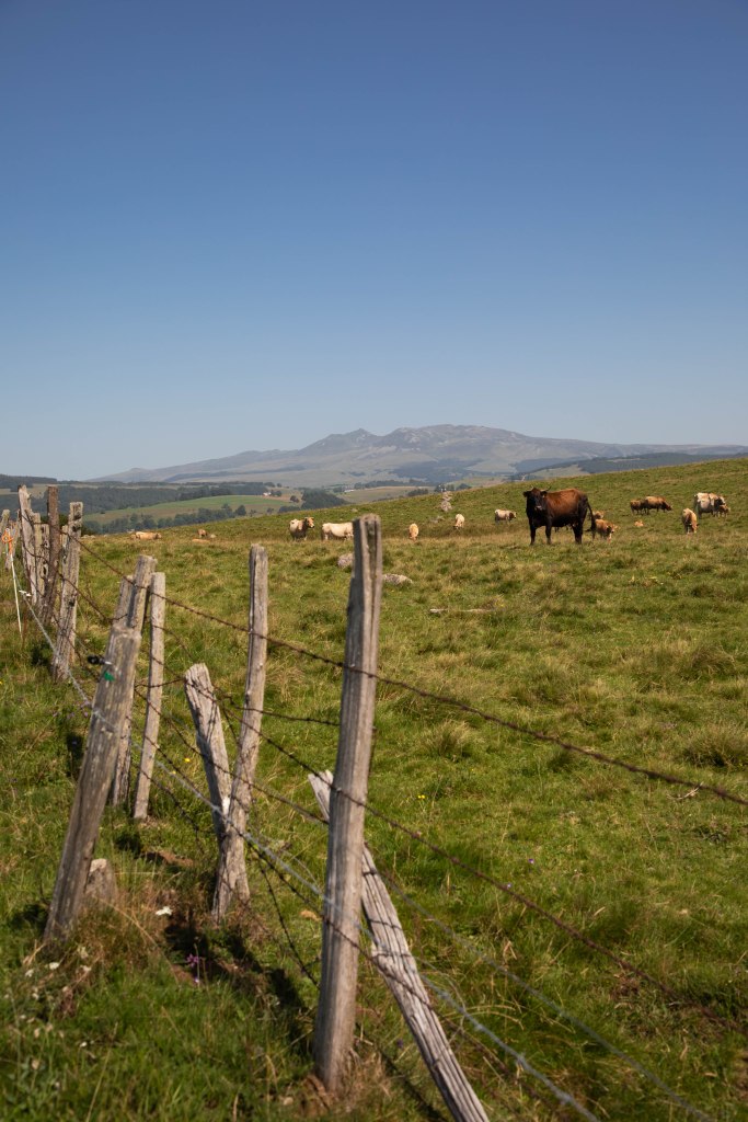 Très rapidement, les paysages typiques du Cézallier s’ouvrent sous nos yeux. On nous les avait promis, ils sont là. D’immenses étendues aux herbes dorées, des troupeaux de vaches qui ponctuent ces hectares de pâturages et, au milieu, notre sentier qui serpente ça et là. Les éléments caractéristiques de ce territoire rural reculé sont tous là : les piquets de bois qui délimitent les prairies, nos copines à cornes qui broutent sagement et, au loin, l’horizon joliment vallonné qui nous raconte le passé volcanique et glaciaire de la région. Sur le côté, la silhouette massive du Sancy se dessine, apparaissant comme un mirage dans l’atmosphère brumeuse de cette chaude journée d’été. Les températures sont brûlantes et les paysages prennent un air de désert dans lequel il est de plus en plus difficile de trouver un coin d’ombre à mesure que nous avançons. Heureusement nous croisons quelques petits cours d’eau dans lesquels nous trempons les casquettes, la nuque, les mains et même les pieds.