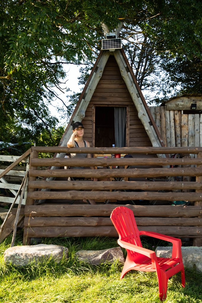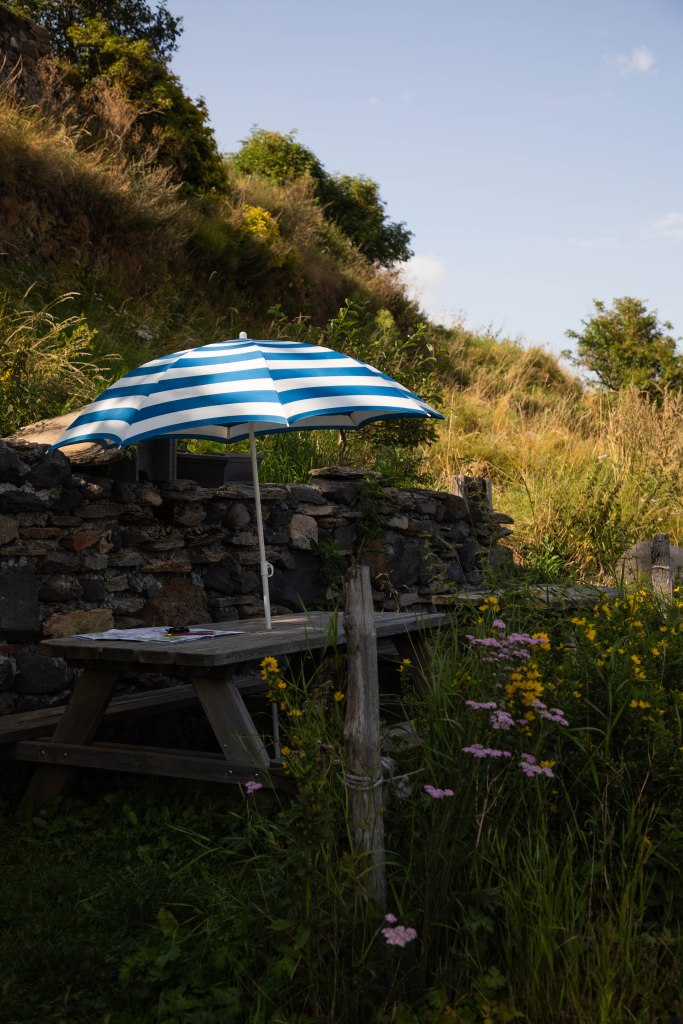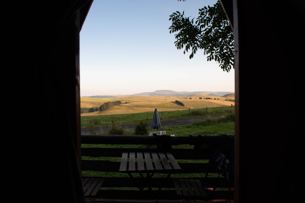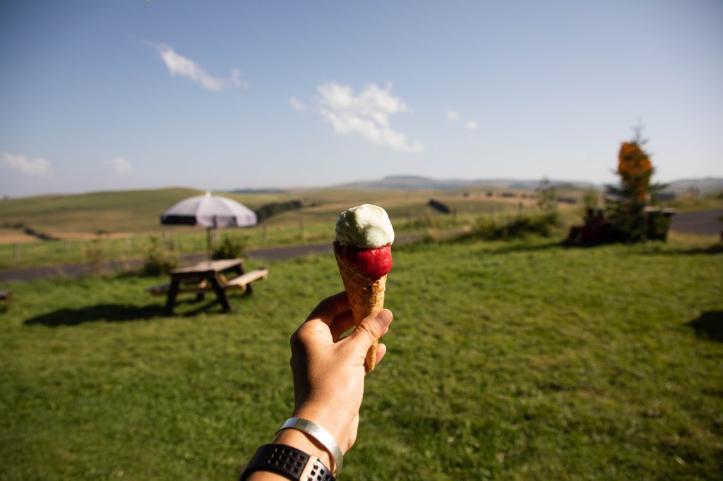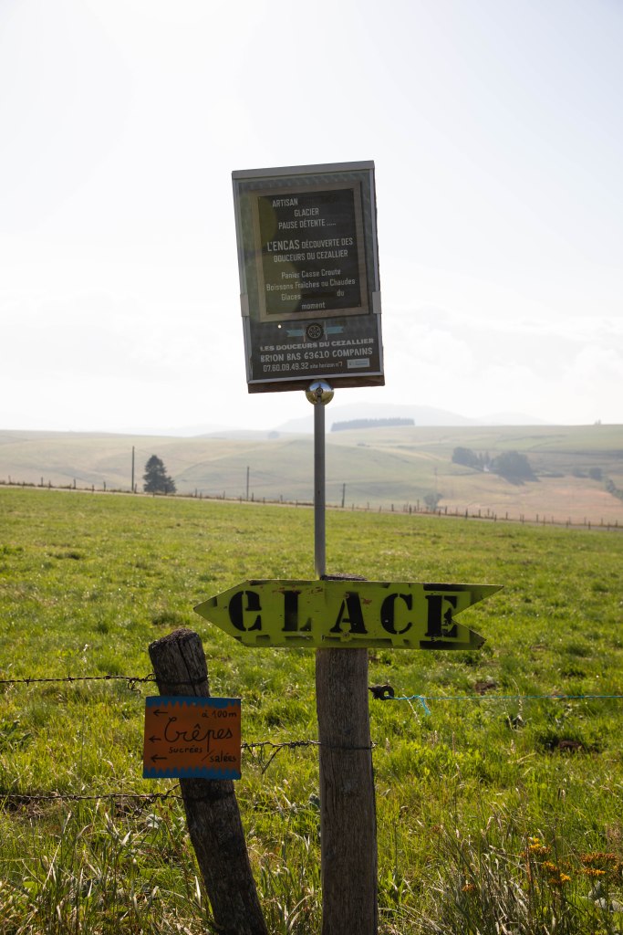 Encore quelques mètres et c’est la récompense lorsque l’on parvient aux « Cabanes du Cézallier« , petit coin de paradis où l’on retrouve, ô bonheur, un petit camion de glaces artisanales tenue par l’adorable patronne. « Une boule verveine et une boule framboise s’il vous plait« , et me voilà avachie dans un banc, à l’ombre, pieds nus face aux paysages grandioses. Ce soir, nous dormirons en cabane, face à ces paysages et sous un ciel merveilleusement étoilé.