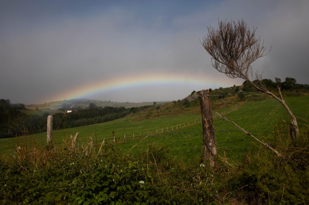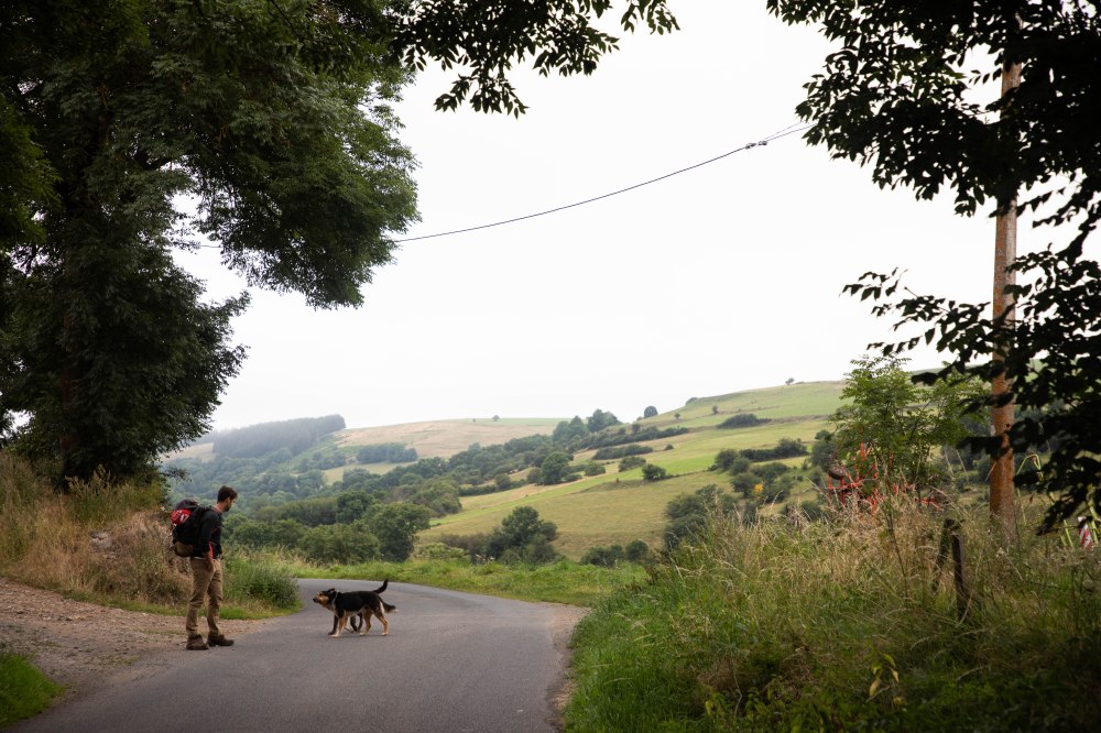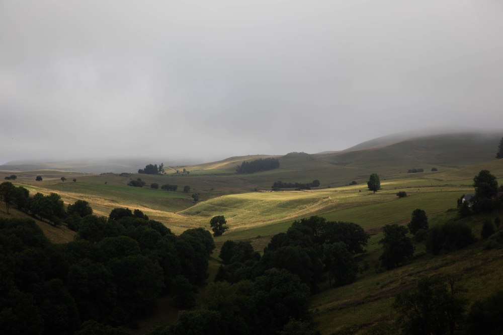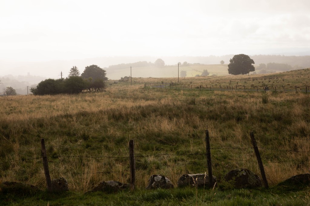 C’est en quittant Allanche que nous découvrons la cité de plus loin, joliment entourée des anciens remparts aux pieds desquels coule la rivière Allanche. A ses côtés, de beaux jardins et potagers sont installés pour profiter de l’eau à proximité et l’on longe alors le cours d’eau pendant quelques mètres pour arriver au hameau de Bac Bas installé entre l’Allanche et le ruisseau de Laneyrat. Quelques vieux discutent au milieu de la route, quelques chiens de fermes viennent nous renifler, et les vaches se rapprochent des clôtures lors de notre passage. La simplicité de la campagne quoi, celle qui me ressource. Nous restons toujours proche de l’Allanche qui devient notre fils conducteur jusqu’à Pradiers. La monté qui y mène nous offre des paysages spectaculaires où la lumière rasante du matin vient dessiner à merveille les collines alentours. La brume est délicatement posée sur les hauteurs et avance à une vitesse fascinante, dessinant au sol des ombres mouvantes. Les paysages se modifient d’une seconde à l’autre et les rayons du soleil viennent éclairer ça et là un arbre, une maison, telles des dieux projecteurs (de rien pour la ref).