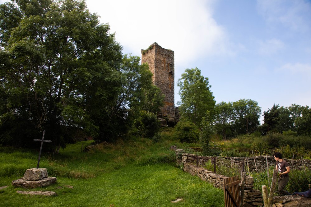 La route nous descend à Anzat-le-Luguet où nous trouvons une boulangerie pour le repas du midi puis rapidement nous arrivons à Besse, minuscule village dont les vestiges médiévaux (tour et maisons à pignons), nous charment. Les chats des fermes environnantes nous regardent passer depuis leur coin de sieste au soleil sans daigner bouger un seul poil. C’est ici un tronçon magnifique qui nous mène au bord du ruisseau de La Bave et de son ancien moulin scierie attenant. Ne cherchez pas, il ne reste du moulin que la roue en bois et quelques pierres ça brinquebalantes. Nous rentrons désormais dans une partie beaucoup plus forestière où l’odeur des champignons nous saute aux narines. Mais l’ombre des résineux disparait ensuite au profit d’un décor totalement différent, très ouvert et plus sec, aux allures de paysages méditerranées. Au loin, pas de mer ou de mouettes, mais les teintes violettes de la bruyère en fleurs et des roches brillantes réfléchissant le soleil. Un très beau sentier blanc nous conduit au village de Leyvaux qui semble hors du temps. Une belle église blanchie à la chaux, une ancienne école et quelques maisons typiques sont nichées dans cette vallée secrète. C’est ici que nous décidons de faire halte pour le déjeuner sous l’œil protecteur du Christ. Les chaussures enlevées, on profite de la pelouse douce du jardin de l’église pour se reposer quelques heures.