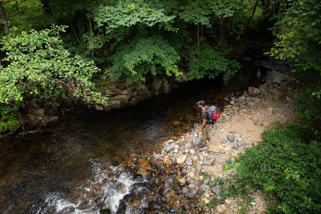 Le repos ne dure pas longtemps car une importante montée nous attend à la sortie du pont. De celle qui vous casse les pattes et vous empêche de respirer correctement à cause d’une moiteur excessive qui me rappelle les randonnées au Costa Rica. Sauf que cette fois-ci, je n’ai pas de jus de Coco qui m’attend à la sortie. Nous devons donc désormais remonter tout ce que l’on a descendu ce matin. C’est sous les branches des hêtres que nous grimpons difficilement, encore alourdis par les chips et le fromage englouti quelques minutes auparavant. J’aurais dû lire plus attentivement la carte IGN et me douter qu’un repas au sommet serait plus judicieux.