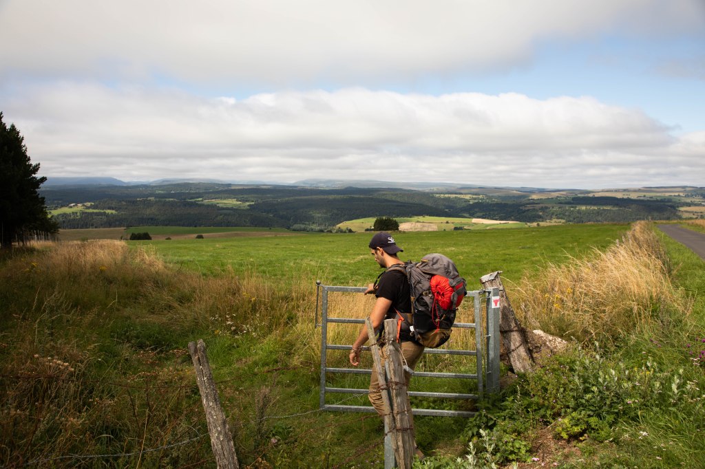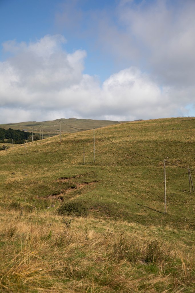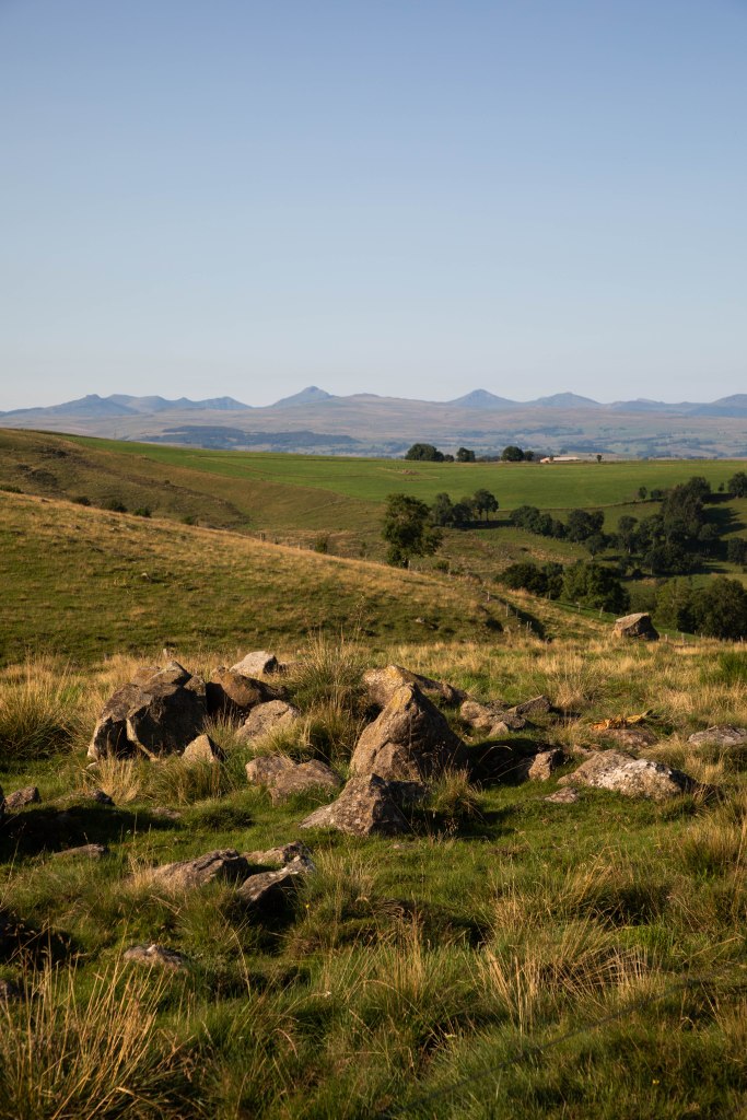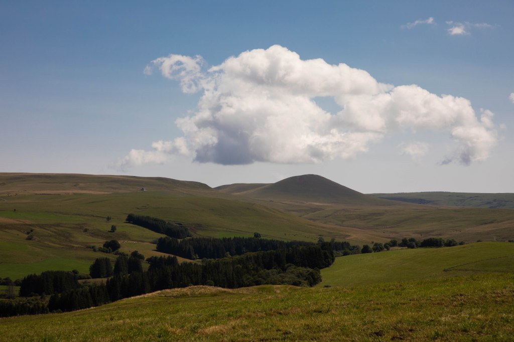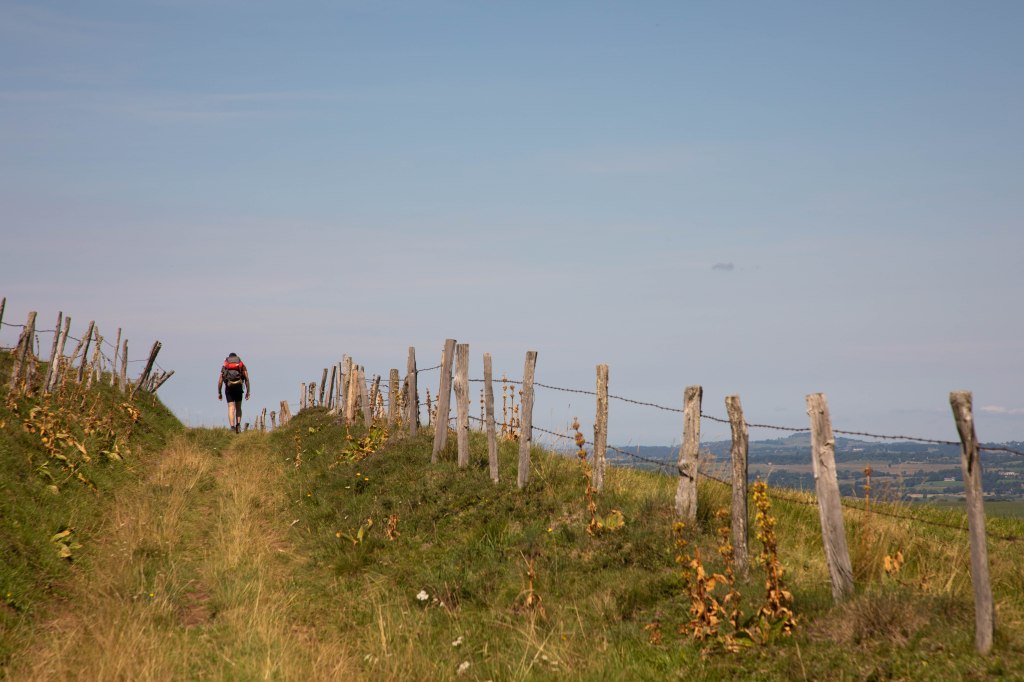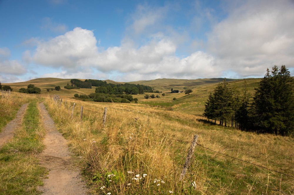 Une étape courte qui fait du bien aux jambes et permet de se reposer à l’arrivée (ou de faire la grasse matinée pour les marmottes) et profiter des beaux paysages du jour ! Le balisage nous fait quitter Peyrusse pour monter sur les hauteurs de Peyrusse le Château (Peyrusse mais avec un château quoi), hameau agricole, avant d’arriver sur un plateau grandiose où nous retrouvons nos décors chéris typiques du Cézallier. Après deux étapes précédentes dans des décors plus fermés, boisés et agricoles (la partie la moins jolie, n’ayons pas peur des mots), nous avons de nouveaux face à nous des prairies en plateau sur des kilomètres à la ronde et les alignements de piquets en bois s’enchainent à perte de vue. Au Col de la Croix de Lampres, on profite même d’un panorama à 360° qui s’ouvre sous nos yeux. Les herbes dorés des champs dansent dans la brise et nous avançons sur un sentier en plein milieu des prairies. C’est à partir d’ici que la boucle opère une bifurcation plein Nord pour avancer face au massif du Sancy et on s’aperçoit dessuite du changement d’ambiance.