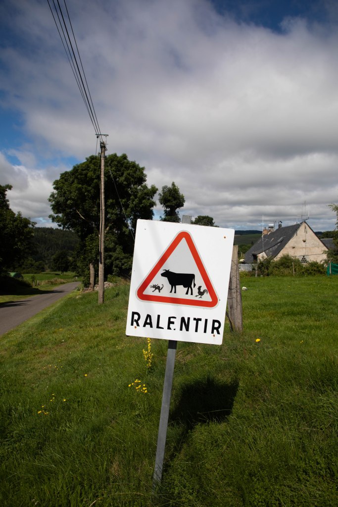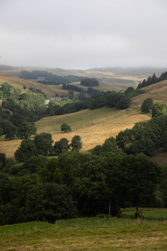 Nous partons ce matin dans une brume enveloppante et un vent chaud. Au loin, les paysages se découpent joliment dans le brouillard. Après deux journées très chaudes, c’est presque un plaisir d’enfiler une veste chaude (et de rentabiliser cet achat!). Je redécouvre le plaisir de partir tôt, à la fraiche. Les kilomètres passent plus rapidement et l’ambiance est toute autre. Dans les villages traversés, les volets sont encore fermés et seuls quelques lève-tôt sont déjà dans les ruelles. Les paysages du Cézallier apparaissent totalement différents. Désertiques et brulants jusque là, ils semblent ici beaucoup plus mystiques et l’on ressent tout le calme et le vide de ces zone rurales dépeuplées. Mais ce n’est pas pour me déplaire ! J’ai même l’impression d’avancer dans l’univers post-apocalyptique de The Walking Dead. Les vaches en plus.