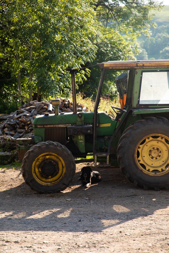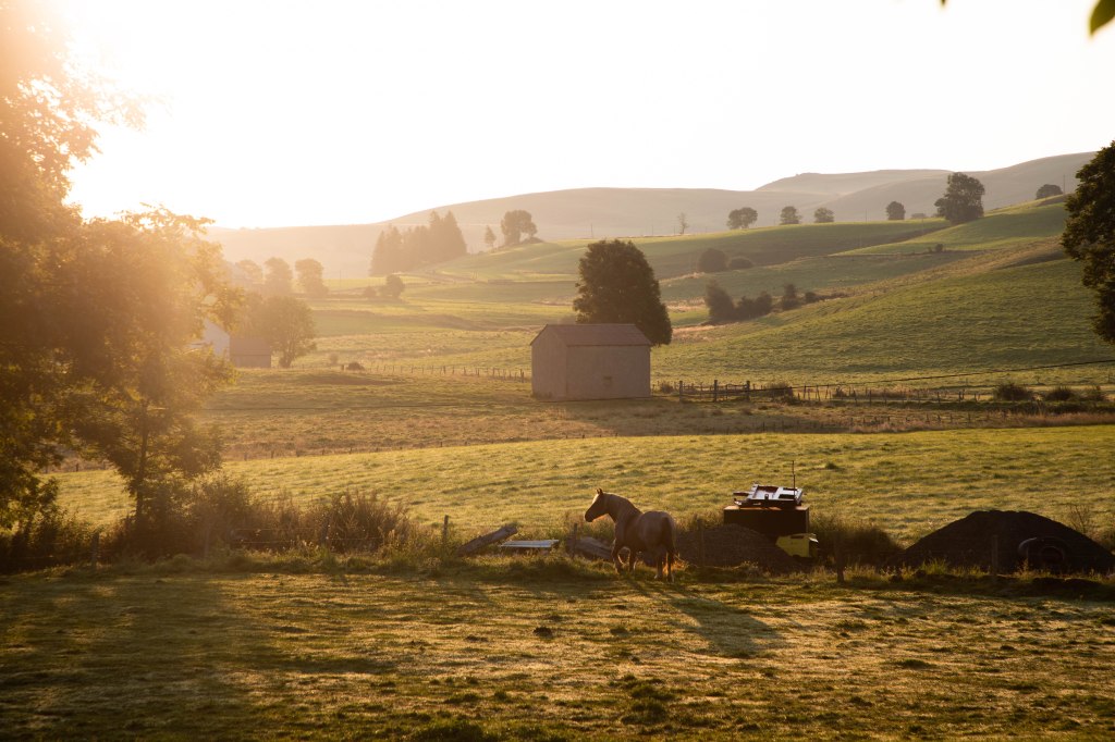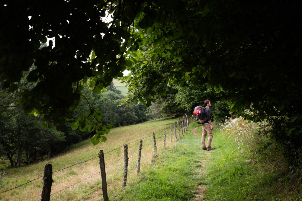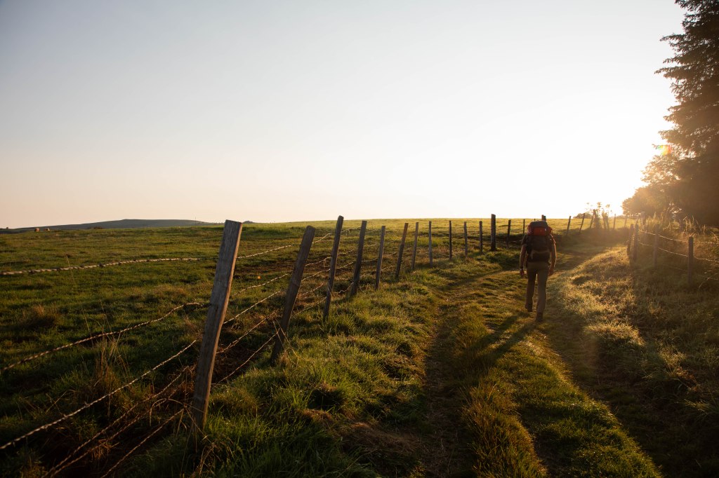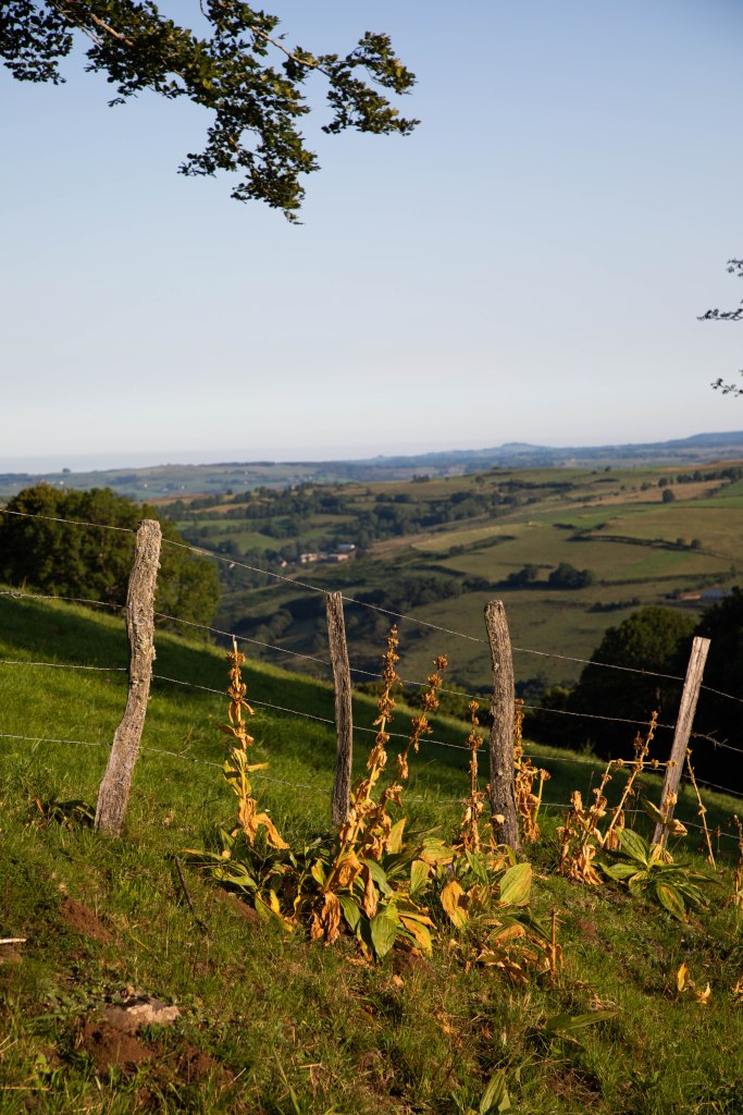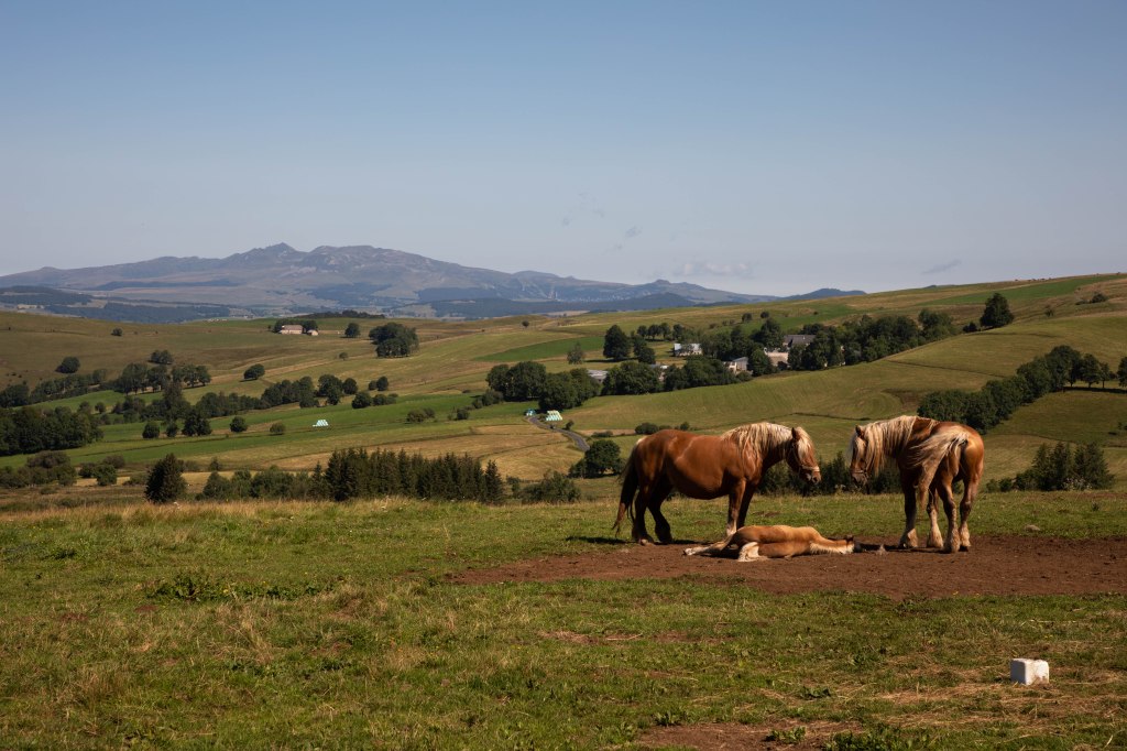 Nous partons trés tôt ce matin là pour profiter des lumières dorées et réconfortantes de ces journées d’été (et arriver pour l’heure de la bière). Dès les premiers kilomètres, les doux rayons de soleil nous font oublier la fatigue du réveil. Tous les paysages s’enveloppent d’un jaune éclatant et les ombres des arbres s’étirent jusqu’à nos pieds. Nous sortons de Marcenat par les « quartiers résidentiels » un peu à l’extérieur du centre pour nous enfoncer rapidement sur un sentier herbeux en bordure de clôtures. Les chevaux et vaches eux aussi réveillés aux aurores nous accompagnent face à une vue somptueuse sur le massif du Sancy vers lequel nous nous rapprochons. Et comme disait Sylvain Tesson, je suis persuadée que ces amis à poils profitent eux-aussi de ces beaux paysages.