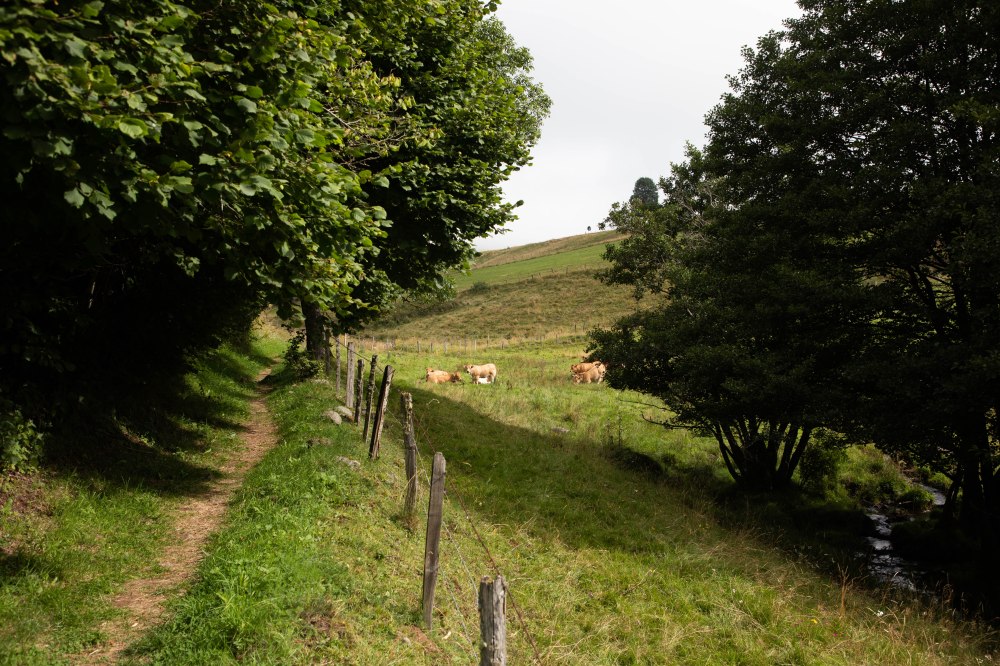 Le premier tronçon n’est pas le plus beau coin de cette randonnée avec un long passage plutôt ennuyeux au milieu de champs cultivés et leurs ballots de foin. Nous traversons quelques hameaux agricoles avant de descendre dans les gorges de la Sianne qui s’annonce plus agréable. De loin, nous voyons déjà cette vallée luxuriante se dessiner avec, au premier plan, toujours, les silhouettes des ruminantes habitant les prés immenses. Nous nous enfonçons peu à peu au creux des gorges pour découvrir en contrebas le Moulin de Fournial magnifiquement restauré. Avec son pont de pierres, sa foret attenante et sa rivière, c’est un véritable havre de paix où l’on s’arrête le temps du pique nique. Dans l’eau, des truites sont présentes abondamment comme souvent en Auvergne, mais également quelques loutres discrètes d’après les dires des habitants…