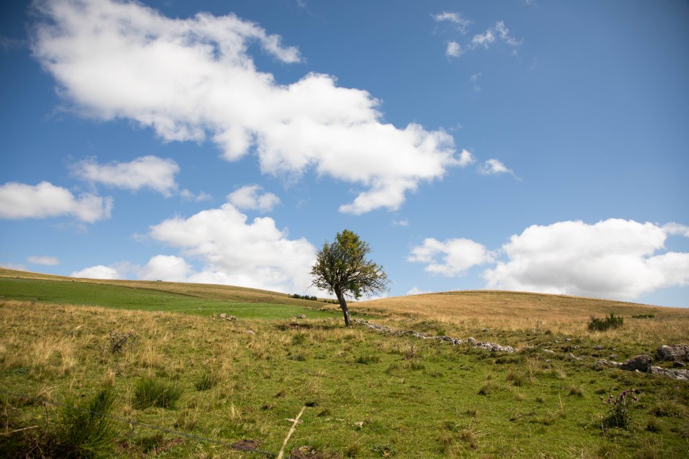 Puis il y a cette dernière ligne droite qui nous parait interminable, en plein cagnard (plein soleil quoi, pour ceux qui viennent pas du sud). Ce n’était pas prévu qu’il fasse aussi chaud en Auvergne. Moi qui espérais un peu de fraicheur avec cette randonnée…. Alors on s’abrite sous le seul grand arbre qui apparait au loin, telle un Eden inespéré. C’est hors sentier, c’est derrière des barbelés qu’on enjambe difficilement avec les sacs mais tant pis, il nous faut de l’ombre avant de sécher comme de vieux raisins.