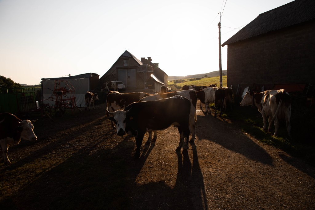 Après un court passage sur le goudron, nous traversons les hameaux presque endormis de l’Estival et de la Maninie. C’est de notoriété publique, les agriculteurs se lèvent tôt et alors qu’il n’est que 7h30 du matin, les vaches sont déjà sorties de l’étable après la première traite ! Le fromage n’attend pas en Auvergne !