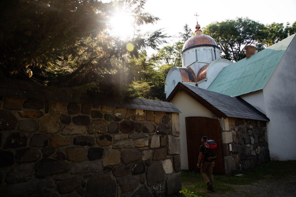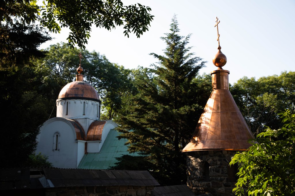 Nous descendons à travers champs, seuls, entourés de gentianes encore en fleurs. C’est cette « reine des prés » qui est savamment utilisée pour la confection de la Suze et l’Avèze, deux alcools locaux. Lorsque l’on remonte alors en direction du hameau du Godde, les Monts du Cantal apparaissant au loin et semblent vouloir faire concurrence aux silhouettes plus acérées du Sancy au Nord. A l’horizon, les différents niveaux dessinés dans le paysage sont une enfilade de champs fleuris, de courbes douces habitées de forêts et d’un ciel bleuté à perte de vue. Et tandis que nous nous croyions en pleine cambrouse, le reflet du soleil sur un toit cuivré nous interpelle. Caché en plein foret, le monastère orthodoxe Znamenié et sa coupole en cuivre brillant apparaissent. Mystique à souhait (et presque un peu inquiétant, faut avouer), nous avons l’impression d’être dans un décor de cinéma tant les lieux sont inattendus ici. Sans faire un bruit, nous pénétrons dans l’enceinte pour nous imprégner de cette ambiance particulière avant de revenir sur le sentier.