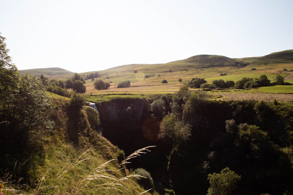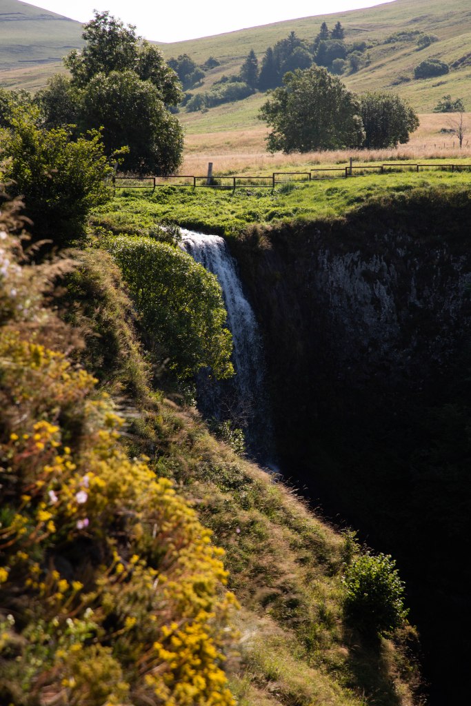 Après quelques kilomètres sur le versant d’une colline verdoyante, la vallée du Bonjon se creuse sous nos pieds et l’impressionnante cascade du Saillant apparait comme dans un gouffre béant. Effectuant une chute de 20m le long de la roche basaltique d’un noir intense, elle termine en beauté au creux d’une prairie verdoyante qui invite à la sieste. On y fait un aller-retour pour la contempler de plus près avant de grimper en face, sur la Montagne du Saillant. On y découvre, perché à flanc de colline, le buron de Naufonts entouré de nos copines à cornes qui profitent toujours, j’en suis sûre, de la vue imprenable sur les Monts du Cantal d’un côté et le massif du Sancy de l’autre. Quelques mètres nous séparent du Lac des Estives, joli joyau face au village vacance. Mais ne rêvez pas, le lac est malheureusement réservé aux vacanciers et pêcheurs…