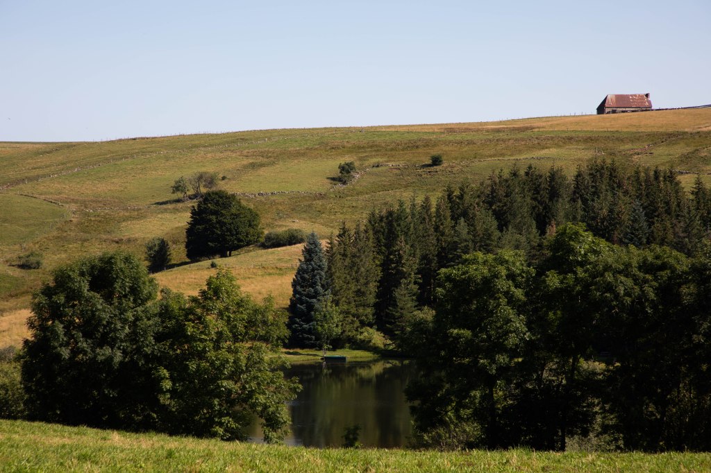 Après quelques minutes de repos à l’ombre, l’appel de la sieste est tentant mais nous repartons vers la Godivelle, l’un des villages les plus attrayants du Cézallier. Avec ses maisons de pierres volcaniques, son emplacement (en plein milieu d’un rien fabuleux) et ses deux lacs, c’est un des points de chute touristique les plus emblématiques du coin. Une pause s’impose en bordure du lac d’en haut, merveilleuse retenue d’eau paisible au creux d’un ancien cratère, avant de terminer notre route jusqu’à l’hébergement du soir à Brion. Nous laissons derrière nous le village et le Lac d’En Bas (inscrit auprès de la Réserve Naturelle des Sagnes et de La Godivelle) pour rejoindre un très beau passage en foret qui nous monte jusqu’à Brion Haut, hameau de montagne qui donne l’impression de se retrouver en plein décor de film ! Quelques maisons, un foirail (toujours utilisé), des corps de ferme typique et une motte féodale suffisent à peindre ce tableau installé sur les hauteurs du Cézallier profitant d’une vue à 360° !