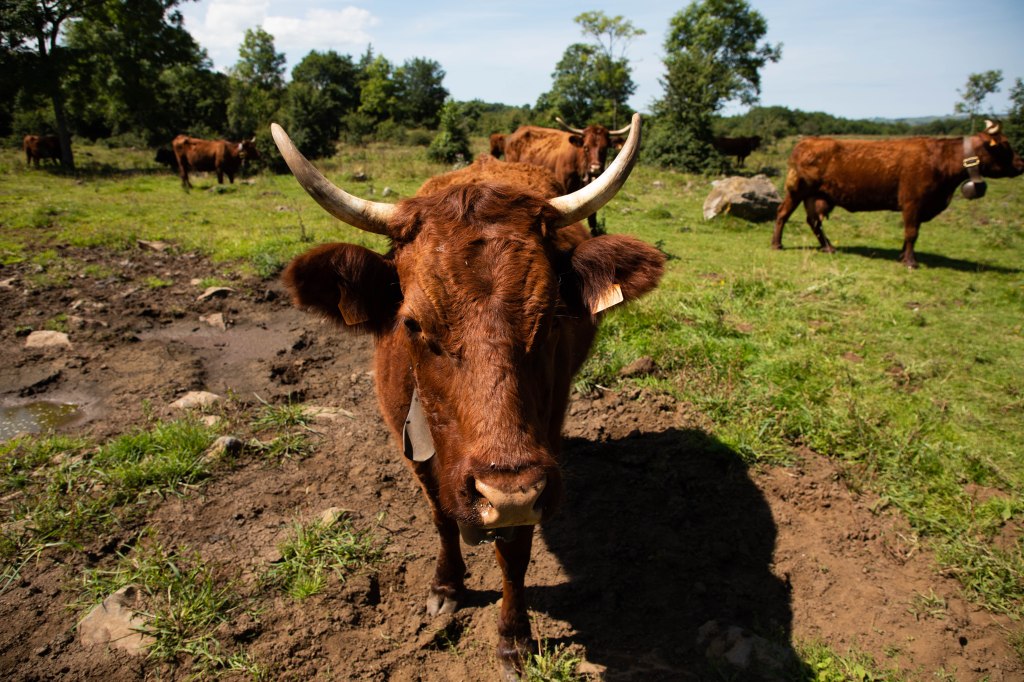 Après les avoir vues de loin, les Salers, reines des lieux, sont toutes proches dans les prairies attenantes au village. Cette race typique qui donne le nom à ce parcours de randonnée, est une véritable beauté. Ses cornes parfaitement recourbées en « guidon », sa robe d’un rouge/marron flamboyant et sa carrure massive en font l’une des espèces les plus anciennes et rustiques. Certains affirment d’ailleurs qu’elle descendrait directement de l’auroch, ancêtre disparu de nos bovins domestiqués.