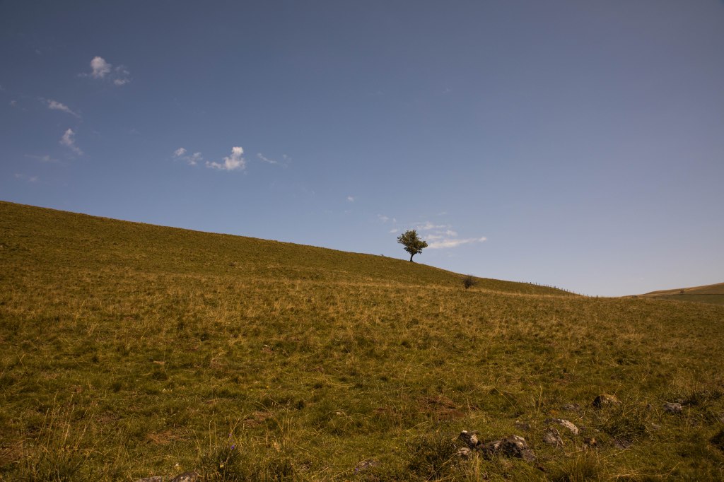 On avale les kilomètres dans ces décors dépaysants jusqu’au buron de Marquizat perdu en plein champ. Telle une oasis rêvée, un arbre solitaire accompagné d’un bac d’eau nous offrent une fraicheur bienvenue. En regardant à l’Ouest, les formes arrondies des Monts du Cantal apparaissent au loin, comme une fin de carte. Le ciel semble toucher les sommets accessibles des anciens puys volcaniques peu à peu érodés par le temps. Nous ne croisons personne sur cette portion jusqu’aux derniers kilomètres qui nous séparent de Marcenat. La civilisation apparait de nouveau, presque bruyante, avec l’épicerie du village, le café et les cris des enfants jouant sur la place principale.